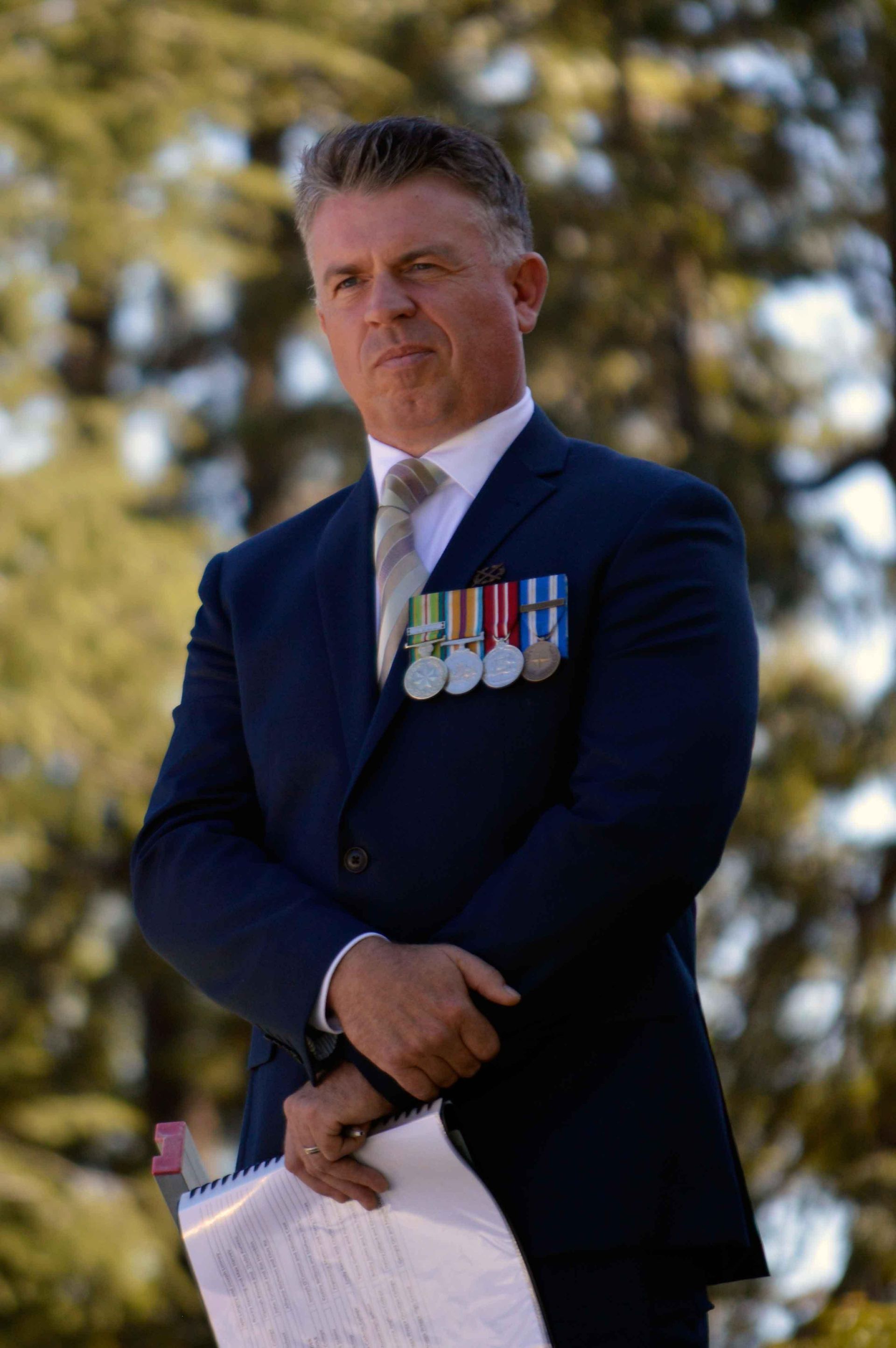 RAAF Warrant Officer (WO) Graham Schilling gave the keynote address, reflecting on his service since 1988 to the present time, which included deployment with Operation Slipper to Kyrgyzstan and the United Arab Emirates. WO Schilling acknowledged those who served over the last 50 years in peacekeeping operations and conflicts and thanked the families who supported their loved ones during deployment.