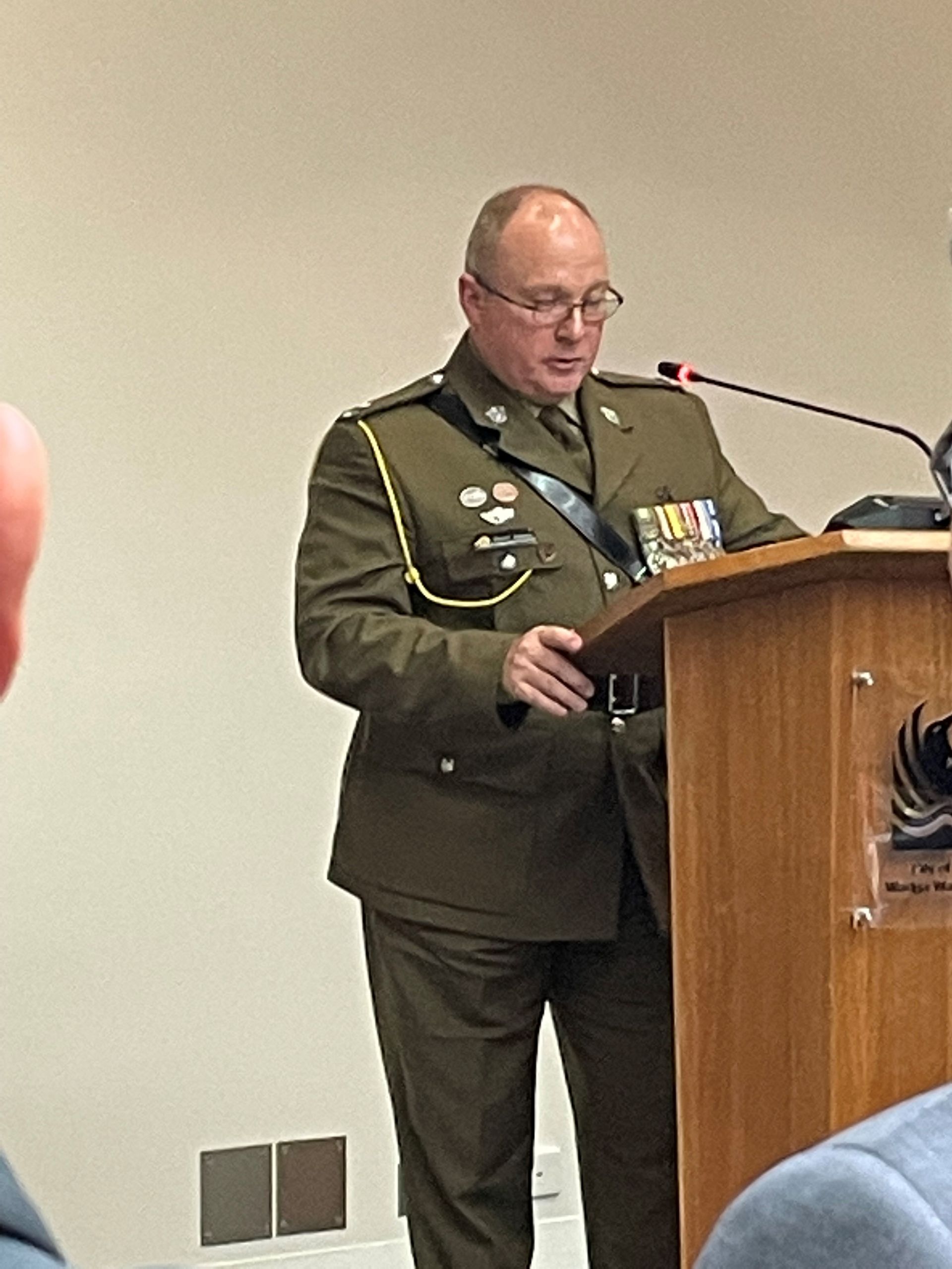 See below the photos from the MEAO Commemorative Service of Major White (R) presenting her speech and Wayne Lennon (L) delivering The Ode.