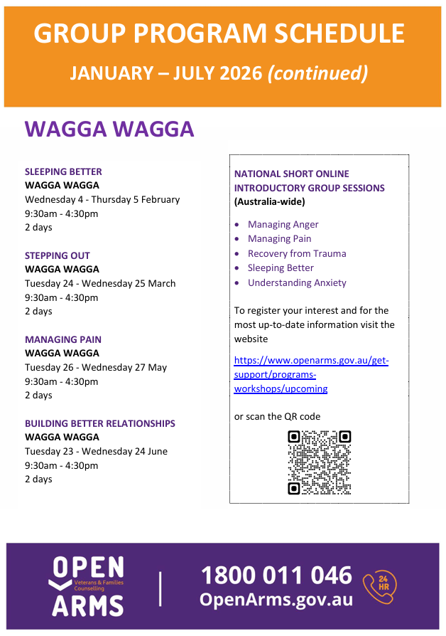 This year, Open Arms will be holding group programs locally and online. Please find below, the Open Arms program schedule for Wagga Wagga in 2026.