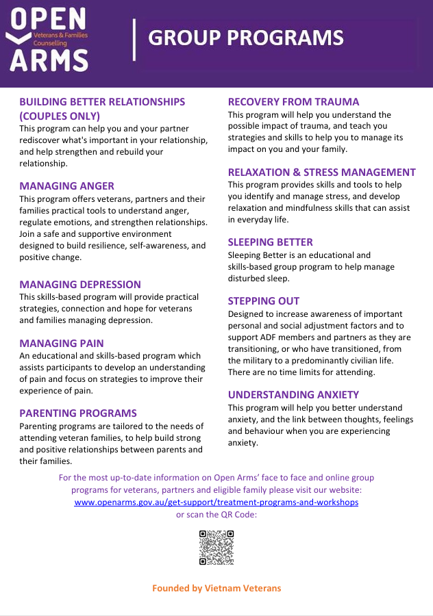 To gain more information, please scan the QR code, call Open Arms on 1800 011 046, or follow this link: https://www.openarms.gov.au/.../programsworkshops/upcoming